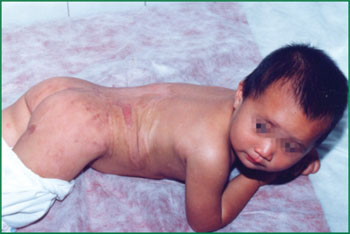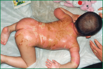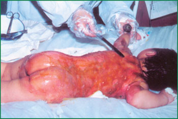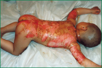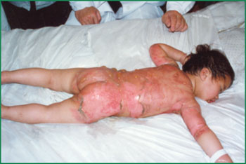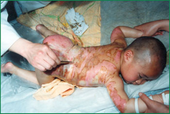 1、 傷后第1天,淺Ⅱ度、深Ⅱ度淺型燒傷創(chuàng)面的表現(xiàn),可見大小不等的水皰,放掉皰液,保留皰皮。