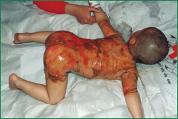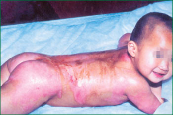 4、 傷后第4天,淺Ⅱ度創(chuàng)面逐漸愈合,深Ⅱ度淺型創(chuàng)面壞死組織液化(腰背部),每4小時(shí)涂藥一次(夜間可推遲到6~8小時(shí))并去除薄軟膜。
