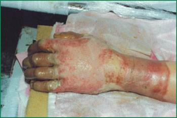 2、 傷后5天去除腐皮,創(chuàng)面壞死皮膚組織液化排除。