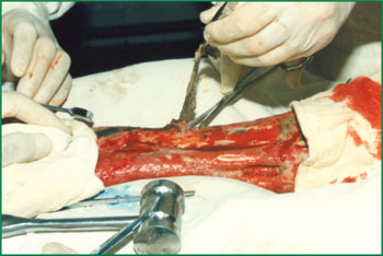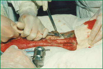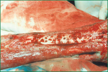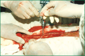 4、 用骨鉆在骨面按間隔1厘米鉆孔,鉆孔深度達(dá)髓質(zhì),有微出血。