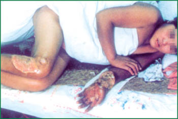1、 該病例為電擊傷,手腕、前臂部位嚴(yán)重?fù)p傷。手腕前肌肉群全部壞死,尺橈動脈壞死,骨間動脈尚存活,上肢壓疼點(diǎn)至肘部。