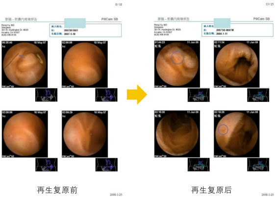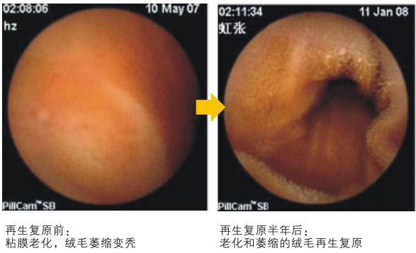 這個例子(下圖示)是2007年5月10日再生養(yǎng)生前的胃鏡檢查結(jié)果,顯示腸絨毛部分脫失,全部萎縮,經(jīng)過再生復原6個月后胃鏡顯示腸絨毛大部分再生了,胃腸年輕化。這在科學史上是史無前例的,而我們卻完成了,在座會員的胃腸道也會產(chǎn)生同樣的變化,即使七八十歲的老人在經(jīng)過再生復原之后也會使部分腸絨毛再生。胃腸再生是器官再生的最好寫照,比手指再生還要重要,因為在再生更新胃腸道之后,其他器官也將會再生更新?;加?2年冠心病的患者在進行全身再生復原后,冠心病治愈了,這也讓所有的醫(yī)生感到驚奇,因此可見通過胃腸道的改善,可以將身體的其他器官全部改善。在改善胃腸道之后,即使不再食用再生物質(zhì),進食普通食物也將會使生活質(zhì)量比原來大大改善。