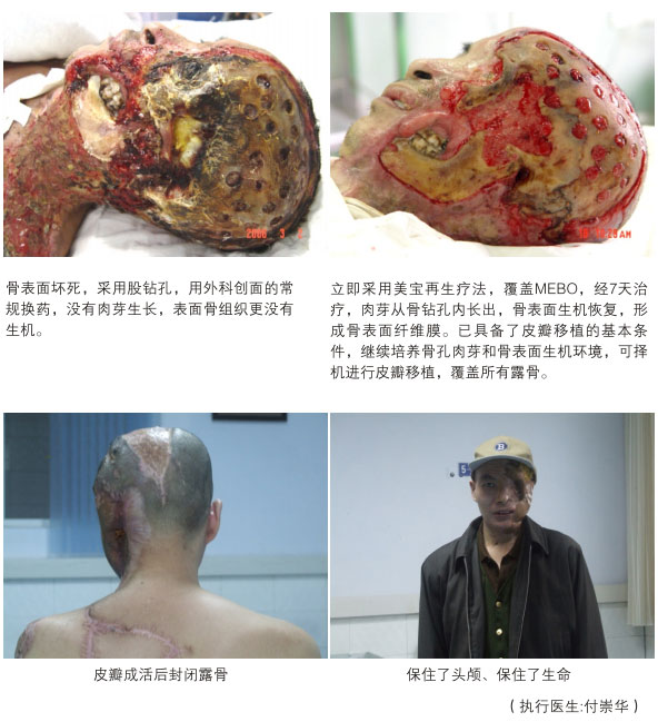 2. 壞死面、顱骨的重新原位再生:這項臨床應用技術已成為再生治療的常規(guī),現(xiàn)舉例說明,患者左側(cè)頭部電爐烤傷,軟組織焦化,面顱骨大部分壞死,醫(yī)院開始用外科方法治療,將顱骨和面部骨骼鉆孔,見鉆孔深度的骨組織壞死,沒有肉芽長出。無奈之際,采用再生療法,經(jīng)一周的再生復原療法治療,鉆孔處肉芽再生出來,壞死的骨組織復原,原位再生出骨膜。從而創(chuàng)造了皮瓣移植的條件,最終救活患者。(參見圖5)