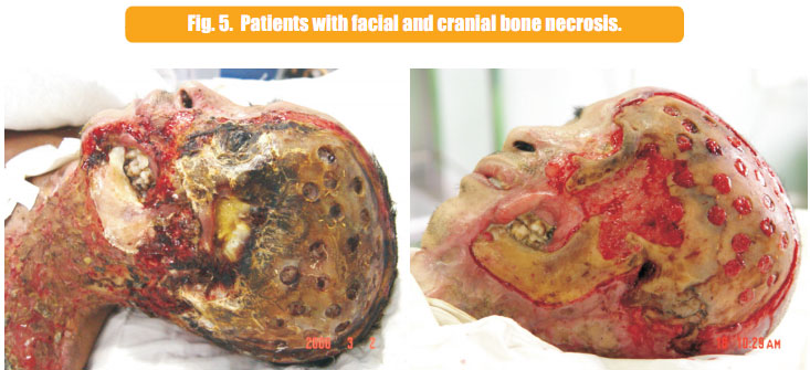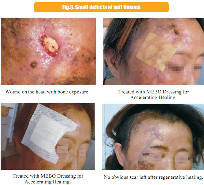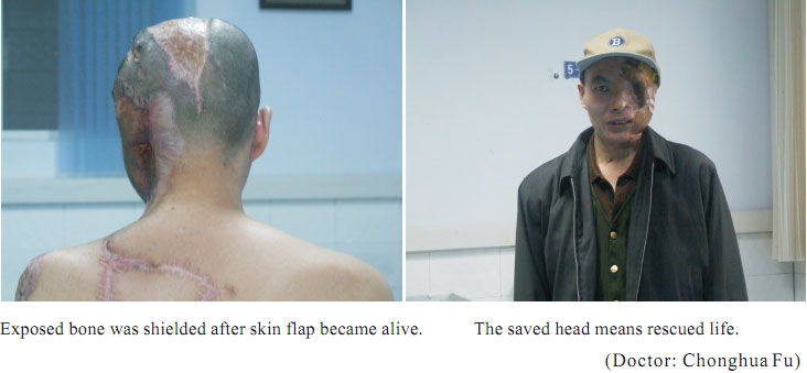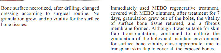This clinical technique has become the routine protocol for regenerative treatment in China, following is an example: the left side of head was scorched by electrical oven and seriously injured, soft tissues charred, larger part of the facial and cranial bones necrotized.  At the beginning, doctors gave him surgical treatment and drilled the facial and cranial bones.  When no new tissue grew out of the deep holes after treatment for a while, they had to change to our regenerative treatment; after one week of regenerative treatment, granulation regenerated from the holes, necrotized bone was restored, periosteum was regenerated in situ, and it became suitable again for skin flap grafting, the patient finally was rescued.  See the following pictures.
