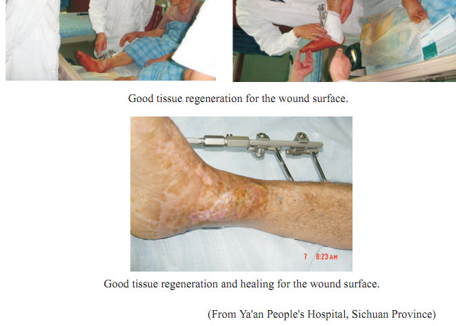 All 152 cases of open wound patients from 2008 Sichuan Earthquake healed by regenerative restoration treatment (not including small wounds), no amputation occurred to them.  For example, while a pediatric patient was about to be amputated under the advice of a western doctor, under the care of Wu Bangguo, the head of China National People's Congress, who was just inspecting the disaster-stricken region, the patient was changed to regenerative treatment, achieving regenerative healing without amputation.