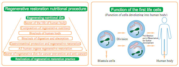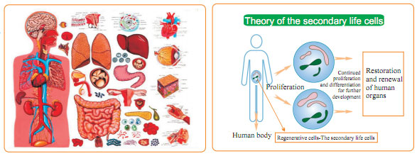 The basis of regenerative restoration refers to the secondary life potential of the human body.  Since the merger of a sperm and an ovum into one cell, the zygote-derived cell will develop into a human being under certain life conditions and last until the end of the person’s life circle, which is the so-called first life of the cell.  So where dose the secondary life cell come from? It is impossible from recombination of sperm and ovum, which would form a new human.  Even the cloned human can not be considered as the original one.  For years, we are making efforts to seek the clue of the existence of regenerative secondary life.  If there is, then where is it?  Finally, this long-chased vision was discovered in our medical practices in treating burns when we found the source of regeneration---the cells which could regenerate into new skin in deep burn wound.  In 1980s, I proposed the theory that human body has the potential of regeneration.  Though I claimed the theory mainly on skin regeneration, no one believed it at that time, and someone even blamed me as fraud.  The opposing voice lasted for many years till the year of 2000 when the truth changed their mind.  By then, we have already started the studies on regeneration of other organs based on the principle of skin regeneration.  The studies were initiated by my assumption that it is possible to realize other organ regeneration if skin regeneration has come true.  The first study is gastrointestinal (GI) tract regeneration.  Considering GI tract and skin derived from two different embryonic germ layers, the success on GI tract regeneration indicates the possibility of regeneration of organs derived from the same germ layer.  So based on the experience from the skin regeneration, I started the study on GI tract mucosa regeneration on the cell level, which was followed by the results of GI mucosa regeneration and restoration in aged gastrointestine within half a year.  The success on GI tract regeneration is more significant than burn skin regeneration or even distal end finger regeneration, because GI tract can represent any internal organs based on their same origin in embryo, and GI tract regeneration means the possibility of all internal organ regeneration.  We have been working on the GI tract regeneration procedure since early 1990s, and completed the first stage by 1997, and published our study results in 2000.  Since 2002, we continued to extend the study from GI tract to 55 tissue organs.  And in 2002, we made a press release titled as “l(fā)ife sciences explosion” when there were 30,000 relevant news reported on the day.  Another five years was spent before all organ regeneration study was finished.  Now, comprehensive human organ regeneration in situ is also completed.