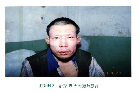 【病例1】患者,男性,27歲,高壓鍋蓋壓力過高,鍋蓋頂飛后熱菜湯燙傷顏面部,為淺Ⅱ度和深Ⅱ度創(chuàng)面,全程應用MEBO,治療19天,創(chuàng)面無瘢痕愈合(住院1周后回家自我治療)。