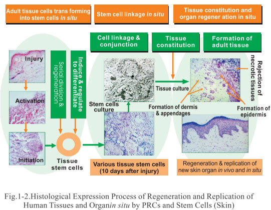 The mapping process of regeneration and duplication of human tissues and organs in vivo and in situ represents a general and typical process. While each different tissue or organ has its own mapping, we will publish them shortly.  Figure 1-3 shows the histological expression process of regeneration and duplication of human skin tissue and organs in vivo and in situ by adult stem cells after burns.