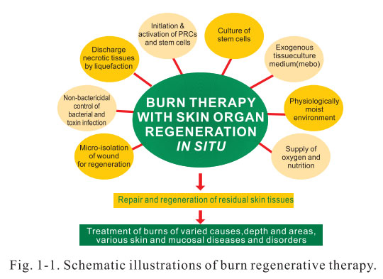 The principal part of BRT is MEBT and MEBO that consist of two procedures and eight techniques. Two procedures refer to liquefaction and discharge of necrotic tissues without causing secondary injuries, and maximum regeneration of skin tissue over the basal layer of viable tissue on wounds. Eight technologies include: initiation and regulation of stem cells; culture of stem cells in vivo and in situ; discharging necrotic tissues by liquefaction without causing further injury; exogenous tissue culture medium (MEBO) for skin regeneration; Physiological controlling bacteria and toxin infection by non-bactericidal mode; creation of a physiologically moist environment for skin regeneration; micro-isolation of skin wound for regeneration as well as supply of oxygen and nutriments required for skin regeneration (Figure 1-1).