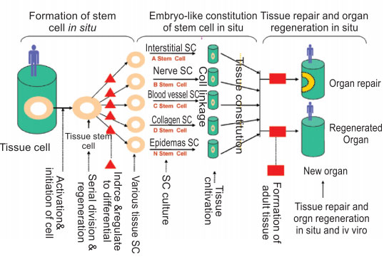 Despite continuous progresses in science and technology, few attempts have been made to successfully develop functional tissue or organs from human cells. The exception is our embryology study and our work on the adult stem cells in vivo and in situ.  Almost one decade ago, American researchers tried to establish a new life science system using various approaches and electronic technologies, but ended up only describing an ideal blueprint for the human genome. However, without sufficient understanding about cells, the genomic research that only focuses on life substance within the cell is of little applicable value since genes play their roles under the assistance of the function of cells.  It is true that genomic research is very important in the life science, but such research will accomplish nothing if it is removed from cellular biochemistry and cytology.  While an important approach to life science research, gene technology proves inadequate to solve any health problem or cure any disease unless combined with appropriate use of cytology focused on harnessing the function of the cell, life’s smallest unit.