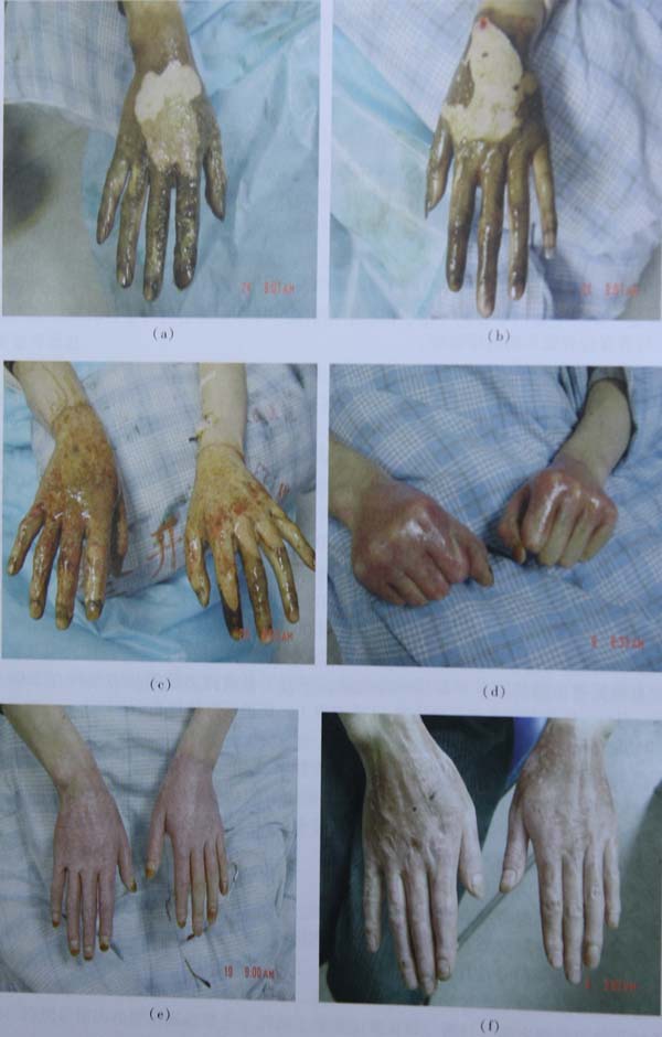 手部深度燒傷后給患者帶來了巨大的心理負(fù)擔(dān),有的影響到臨床治療。我們根據(jù)患者不同的個(gè)性、不同的文化層次制定了不同形式的心理護(hù)理措施,增進(jìn)醫(yī)患交流,讓病人知曉燒傷的深度和面積,了解MEBT/MEBO治療燒傷的簡明原理,了解增生性瘢痕發(fā)生與轉(zhuǎn)歸過程,使傷員積極配合臨床治療與康復(fù)醫(yī)療,促進(jìn)手功能恢復(fù)。