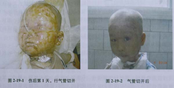 患兒系重度吸入性損傷,圖2191燒傷后第1天,持續(xù)低流量吸氧后,血氧飽和度波動在70%~90%,明顯痰鳴,雙肺散在濕啰音,三凹征,行氣管切開;圖2192切開后,出現氣管軟骨軟化,塌陷,所以,需長期帶氣管套管生活。