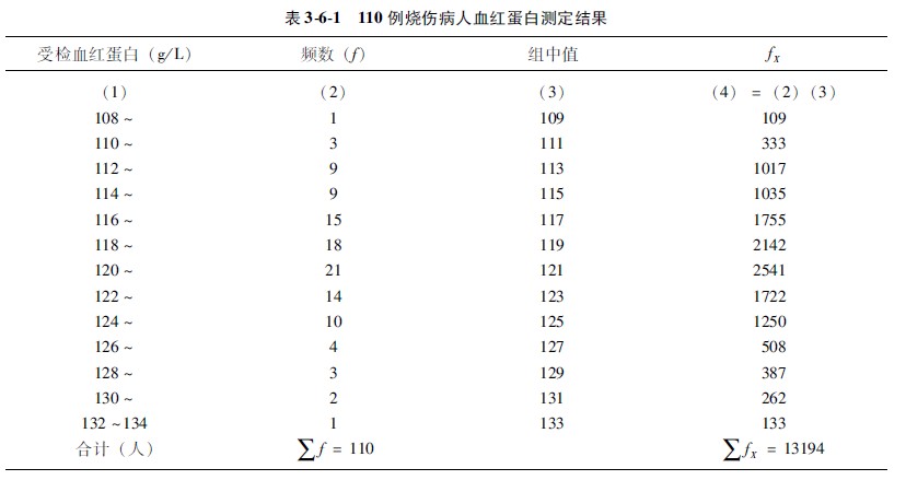 示例362某醫(yī)院測(cè)檢了110例特重度燒傷病人血液血紅蛋白含量,其濃度范圍在115~150g/L之間,頻數(shù)分布情況見表361,利用組中值方法計(jì)算他們的平均血紅蛋白濃度。