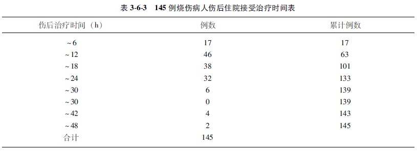 示例364表363中記錄了145例燒傷休克期病人傷后住院接受治療的時(shí)間(見表363),問他們休克期住院接受治療時(shí)間的中位數(shù)是多少?