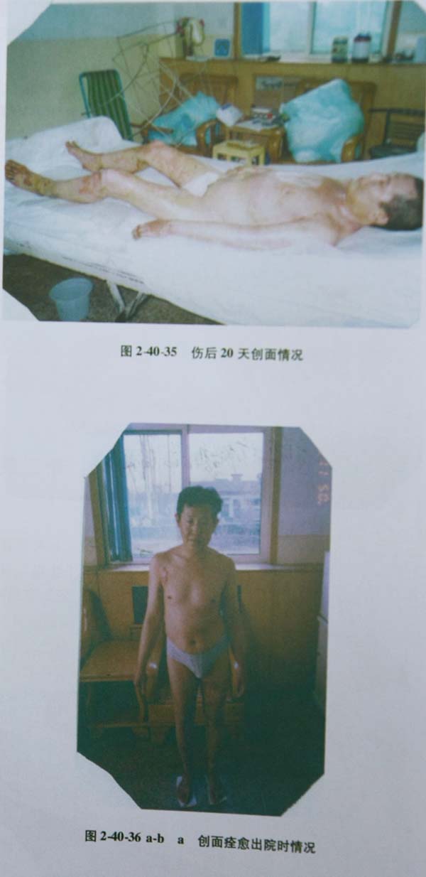 傷后20天,淺Ⅱ度和深Ⅱ度創(chuàng)面大部分愈合,Ⅲ度創(chuàng)面液化良好。繼續(xù)全身營(yíng)養(yǎng)支持,加強(qiáng)創(chuàng)面換藥及肢體功能鍛煉。患者經(jīng)40余天的精心治療,全例程采用MEBT/MEBO,未行植皮,所有創(chuàng)面均達(dá)到無(wú)疤痕愈合,各關(guān)節(jié)活動(dòng)自如,無(wú)功能障礙。
