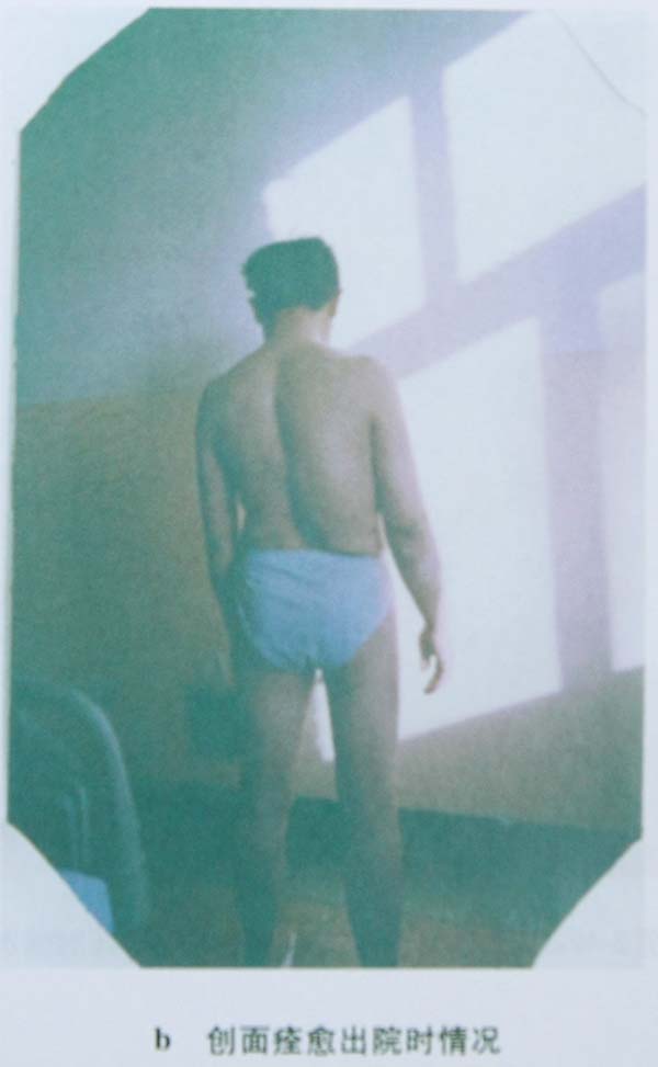 [病例3]患者賈××,36歲,石家莊市尼龍廠工人,住院日期200494日,出院日期20041130日,患者于工作中不慎從五米高處摔下,跌入電石爐中,造成全身堿燒傷,急入石家莊井陘礦務(wù)局醫(yī)院就診。入院診斷工業(yè)堿水全身Ⅱ—Ⅲ度燒傷總面積達(dá)92%TBSA(淺Ⅱ度40%,深Ⅱ度27%,Ⅲ度淺型10%,Ⅲ度深型15%)。即刻采用美寶濕潤(rùn)燒傷膏外涂保護(hù)創(chuàng)面,同時(shí)采取全身系統(tǒng)治療。包括強(qiáng)心、抗休克、抗感染、保肝、保腎、保護(hù)胃腸黏膜、持保水、電解質(zhì)平衡和酸堿平衡、營(yíng)養(yǎng)支持等綜合搶救措施,創(chuàng)面全程規(guī)范應(yīng)用燒傷皮膚原位再生技術(shù)和專(zhuān)用藥品美寶濕潤(rùn)燒傷膏?;颊哂谌朐汉?/span>24小時(shí),發(fā)生全身侵襲性感染,血常規(guī)WBC13×109/L下降到5×109/L、PLT147×109/L下降到8×109/L;肝功 谷丙轉(zhuǎn)氨酶高達(dá)362U/L,精神差,腹脹明顯,體溫395℃,呼吸淺快,36/分。心率快,134/分??诖阶辖C,創(chuàng)面灰暗,并見(jiàn)片狀出血點(diǎn),考慮為膿毒癥及并發(fā)肝、心等臟器功能不全。當(dāng)即給予高效、足量抗生素控制感染,加強(qiáng)心腦肝腎等臟器的支持保護(hù),對(duì)創(chuàng)面進(jìn)行徹底清理?yè)Q藥。