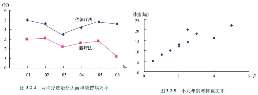 示例324甲醫(yī)院2001~2006年用傳統(tǒng)療法治療大面積燒傷病人的病死率分別為:50%、46%、35%、42%、48%、46%;用新療法治療大面積燒傷的病死率分別為:30%、31%、22%、26%、28%、12%。繪制線圖(見示圖325)。