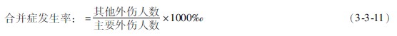 指一批或一組主要疾病病人所伴隨的其他疾?。ㄈ鐭齻l(fā)休克、感染、電解質(zhì)紊亂等)的發(fā)病情況。公式和計(jì)算方與公式3311雷同。但合并傷與并發(fā)癥是兩個(gè)不同的概念,前者是與主要病癥相伴發(fā)生的,后者是在治療主要病癥過程中發(fā)生的。