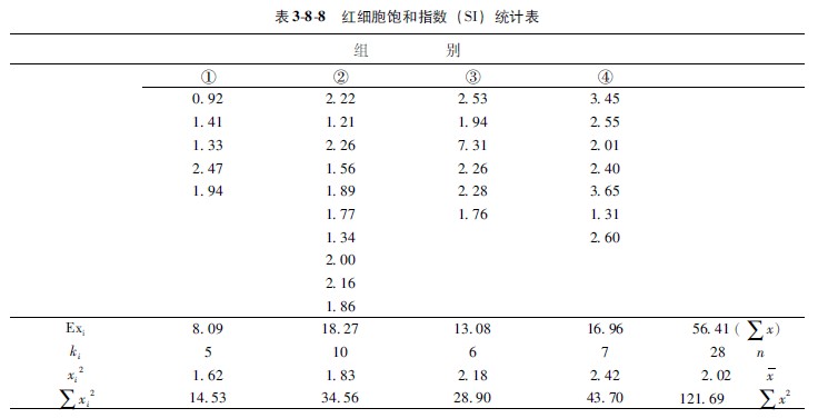 示例382測得輕度、中度、重度、特重度燒傷病人的紅細胞飽和指數(shù)(SI,正常值為09~11)記錄于下(表388),問四種程度的燒傷病人紅細胞飽和指數(shù)(SI)有無顯著差異?
