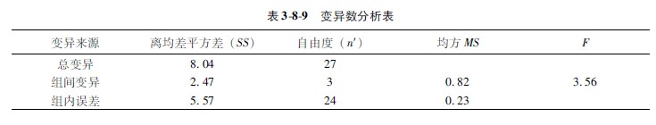 各組個體數(shù)目不同時的F檢驗方法與個體相同者基本相似,只是在計算組間離均差平方和時應(yīng)當注意各組的分母不盡相同。以例382說明: