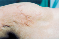 8.深Ⅲ度創(chuàng)面(右大腿及膝關(guān)節(jié)內(nèi)側(cè))自行愈合后3年,瘢痕平整柔軟,無攣縮,不影響功能
