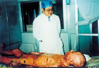 燒傷濕性醫(yī)療技術(shù)用于治療大面積燒傷,一般不受醫(yī)療條件的限制,只要該醫(yī)院具備一般外科治療條件,均可進(jìn)行大面積燒傷治療,特別是不強(qiáng)調(diào)無(wú)菌隔離環(huán)境條件,只強(qiáng)調(diào)室內(nèi)溫度和細(xì)心的護(hù)理,及時(shí)清理創(chuàng)面液化物,遵循外科系統(tǒng)治療原則,均能立足于本單位條件搶救治療大面積燒傷。下圖是燒傷濕性醫(yī)療技術(shù)發(fā)明人徐榮祥教授在治療查看燒傷總面積100%的深度燒傷病人時(shí)的情景。