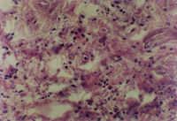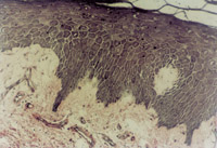 5-3-4a 新生上皮組織和膠原纖維增生,可見典型EB(皮膚胚胎基) HE×40