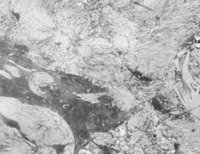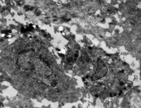 經(jīng)MEBT/MEBO治療10天,創(chuàng)面組織切片可見表皮棘層棘細胞出現(xiàn)并有橋粒連接(圖5-3-14~5-3-15)。顆粒層顆粒細胞出現(xiàn)。在基底細胞層可見黑色素小體(圖5-3-6~5-3-17)。并可見小血管周圍的吞噬細胞有吞噬現(xiàn)象(圖5-3-18),說明其功能也已經(jīng)在恢復。
