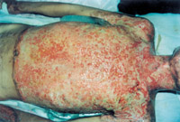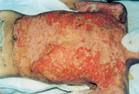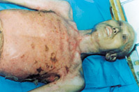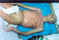 入院后即快速補(bǔ)液糾正休克,行氣管切開,改善通氣功能,左前臂、雙小腿Ⅲ度環(huán)形焦痂切開減張,改善肢端血運(yùn)。上腔靜脈穿刺置右心漂浮導(dǎo)管行心功能各項(xiàng)指標(biāo)監(jiān)測。于傷后第二天行四肢切痂微粒植皮,傷后第六天行胸腹部切痂植大張開洞異體表,傷后10天(術(shù)后4天)胸腹部嵌植小片自體皮?;颊邆?8天出現(xiàn)嚴(yán)重綠膿桿菌敗血癥,持續(xù)低溫昏迷一周,經(jīng)全力搶救,敗血癥得以控制;又先后9次行植皮手術(shù),大部創(chuàng)面封閉;曾于傷后43天出現(xiàn)左眼角膜潰瘍,以點(diǎn)眼、球后結(jié)膜下注射等治療,潰瘍愈合。住院期間為預(yù)防應(yīng)激潰瘍,控制感染,防止肺部并發(fā)癥等,亦采取了相應(yīng)的措施。共住院70天。