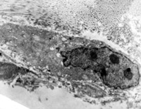 5-2-8 傷后第10天,皮膚附件上皮細(xì)胞成簇分布,核仁邊集,內(nèi)質(zhì)網(wǎng)擴(kuò)張,胞質(zhì)內(nèi)含較多張力原纖維  TEM×6000