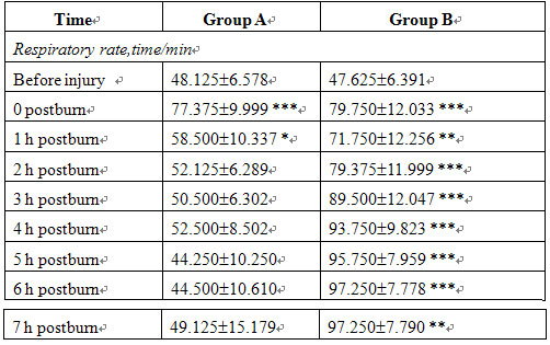 Before injury and at 5 min after injury, RR, HR and ABP were not significantly different between the two groups. In group B, RR and HR increased, ABP decreased progressively postinjury and the blood viscosity was raised markedly after treatment compared with that of before treatment. In group A, the MEBO-treated group, the RR, HR and ABP of all animals gradually recovered to the preinjury levels after treatment while blood viscosity decreased significantly (Tables 3, 4).