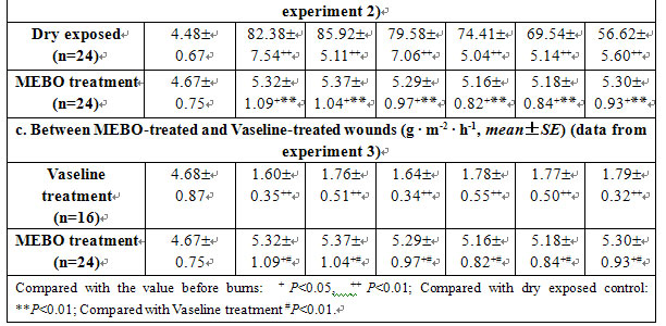 Compared with normal skin, the water evaporation values of burns wounds treated with dry-exposed therapy in both experiments 1 and 2 increased dramatically and reached their peaks at 6 h postinjury, and then tended to decrease slowly. Conversely, the water evaporation of wounds treated with MEBO was much lower (P<0.01, Tables 5a, b). The water evaporation of wounds in the Vaseline-treated group was always kept at a low level, significantly different from that of normal skin as well as MEBO treated wounds (P<0.01, Table 5c).