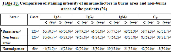 IgA-, IgG-, and IgM-producing cells and C3 in the burns area had higher staining intensity compared to those of the non-burns area and to those of normal persons (P<0.01). The immunity of the local area changed postburn. Immunologic function and reaction were enhanced. In the non-burns area, the immunity was similar to that of normal persons. The difference was not marked (P>0.05; Table 18).
