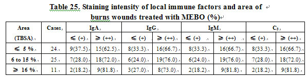 After treatment with MEBO, the larger the burn wound, the stronger the staining intensity of local IgA-, IgG-, and IgM-producing cells and C3, but no statistical difference (P>0.05). MEBO enhanced the local immunity of burn wounds with different area (Table 25).