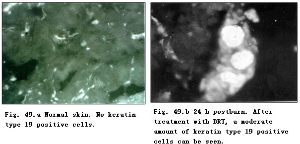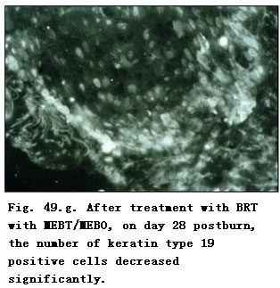 Immunocytochemical examinations were made on normal skin and burns wounds tissue sections treated with specific mouse anti-human keratin type 19 monoclonal antibody. The results revealed that in the normal control of both cases, there were few positive numbers of epidermal stem cells with keratin type 19 (Fig. 49. a). Wound tissue at 24 h postburn showed a moderate amount of positive epidermal regenerative stem cells (Fig. 49. b) and on day 4 postburn, the number of positive epidermal stem cells around the sweat gland, capillaries and hair follicles increased (Fig. 49. c). On days 7 (Fig. 49. d) and 14 (Fig. 49. e), epidermal stem cells containing human keratin type 19 continually increased and exceeded the level attained at day 4 postburn, before gradually reaching a peak level. Prior to days 21 (Fig. 49. f) and 28 (Fig. 49. g) postburn, the number of positive regenerative stem cells decreased to a certain level as the burns wounds progressed to healing. The observation showed that, after treatment with BRT with MEBT/MEBO, the proliferation status of the potential regenerative stem cell of the burns patients changed at a regular rate. We propose that regenerative stem cells may be the source of epidermal regenerative stem cells. The glowing fluorescent cells found observed under the microscope represented the potential regenerative stem cells in the wound tissues of deep second- and superficial third-degree burns. After treatment with MEBO, these stem cells may aid the deep partial thickness burns wounds to heal without scar formation and aid the superficial full-thickness burns wound to regenerate skin while healing spontaneously.