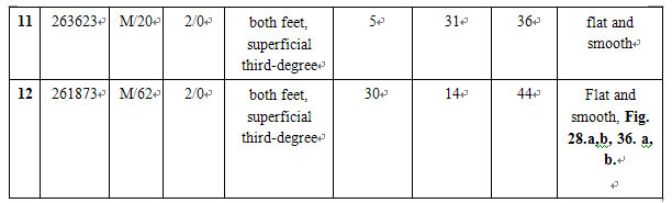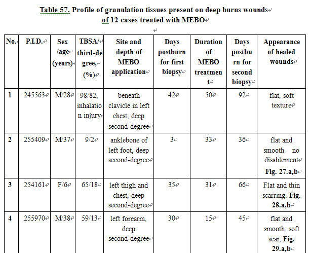 Twelve patients sustained 2-98% total body surface areas (TBSA), including 2-82 % third-degree burns. Most patients had burns mainly on the face and extremities and one patient was complicated with inhalation injury. Some patients suffered extremely severe burns covering the whole body skin. Areas which received MEBO treatment included chest, back, upper arm, thigh, leg, and instep. MEBO was applied on burns wounds in accordance with the standardized MEBO protocol.