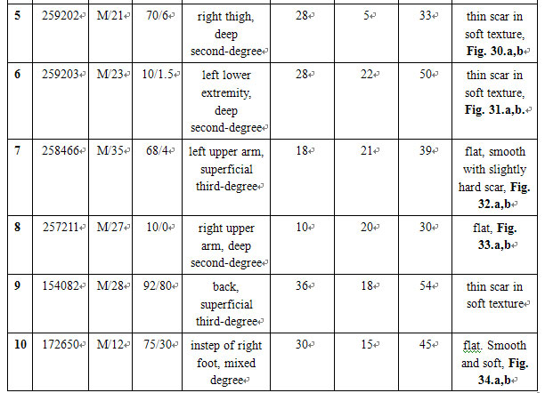 All of these patients were initially treated by conventional surgical therapy in other hospitals. Therefore, this study focused on deep second-degree and superficial third-degree burns wounds with intermediate and late granulation tissue on days 3-42 postburn that were treated with MEBO. The ointment application lasted as long as 5-50 days and the wound healed on days 30-92 postburn. Macroscopic observation of healed wounds showed the coverage of soft, flat and smooth epithelium or soft and flat scars, without the appearance of hypertrophic or contractive scars.