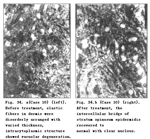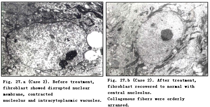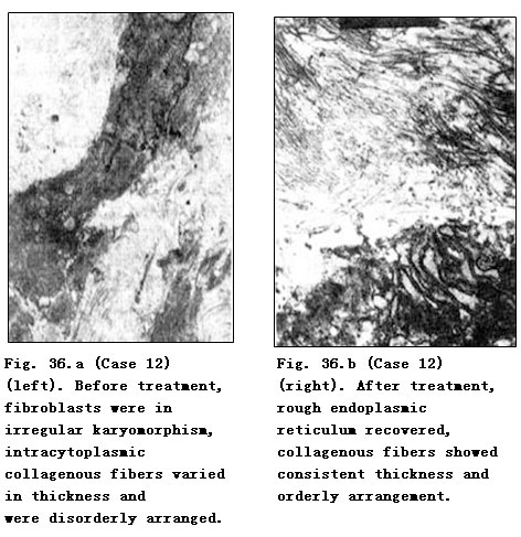 Electron Microscope: Before treatment, fibroblasts showed disrupted karyomorphism, contracted nucleoli, expanded perinuclear space and paranuclear vacuolar degeneration. A faint staining area was observed in the paranuclear margin of mussily arranged fibrocytes. Collagenous fibers varied in thickness with breaking and dissolution. After MEBO treatment, the nucleoli and nuclei of fibroblasts recovered to normal and collagenous fibers appeared to be uniform in thickness and orderly in arrangement. Master cells were occasionally visible after treatment in a few cases. Fibrocytes recovered to normal with orderly arrangement and intracytoplasmic rough endoplasmic reticulum appeared (Table 57).
