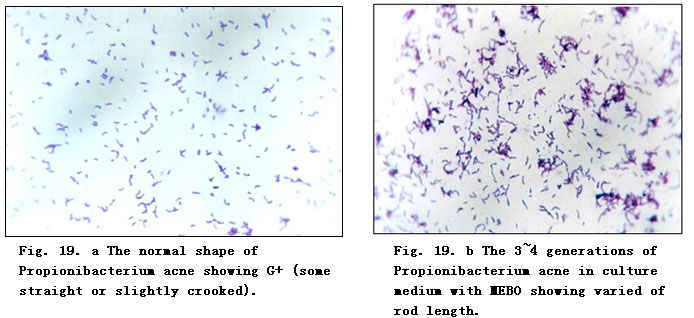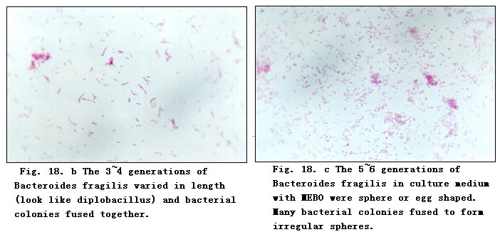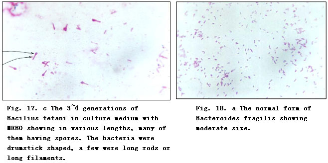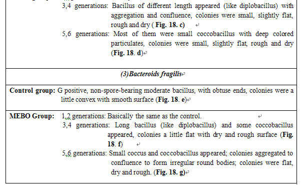 MEBO group. The above-stated four species of bacteria were inoculated respectively into the medium containing a certain amount of MEBO. Anaerobic bacteria were incubated at 37oC for 48 - 72 h as one generation. Candida albicans was incubated at 37oC for 24 - 48 h as one generation. After 4 - 6 successive generations, they were treated with Gram stain and their staining reaction, morphology and colony characters were observed.