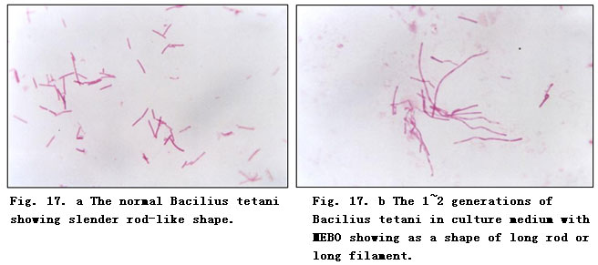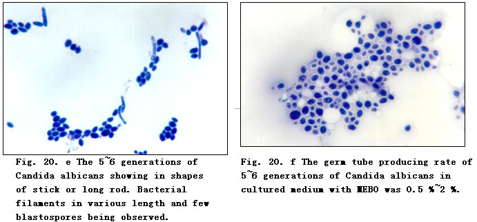 Bacillus tetani is an anaerobic spore-bearing bacteria. After being cultured in MEBO-containing media, long filament variants appeared, and in 3 generations many of them formed only one spore. This spore is not the vegetative form of the bacteria as it cannot proliferate under normal conditions. Spore keeps the bacteria alive though dormant. Only under favorable conditions can the spore proliferate and produce exotoxin to cause disease. After cultured in MEBO-containing media for 6 generations, in Candida albicans the number of blastospores was significantly reduced, the spore tube producing rate was only 0.5% - 2%, while the normal fungi had a spore tube producing rate of 90%. The above facts prove that MEBO has an inhibitory effect on the proliferation and pathogenicity of Bacillus tetani and Candida albicans.
