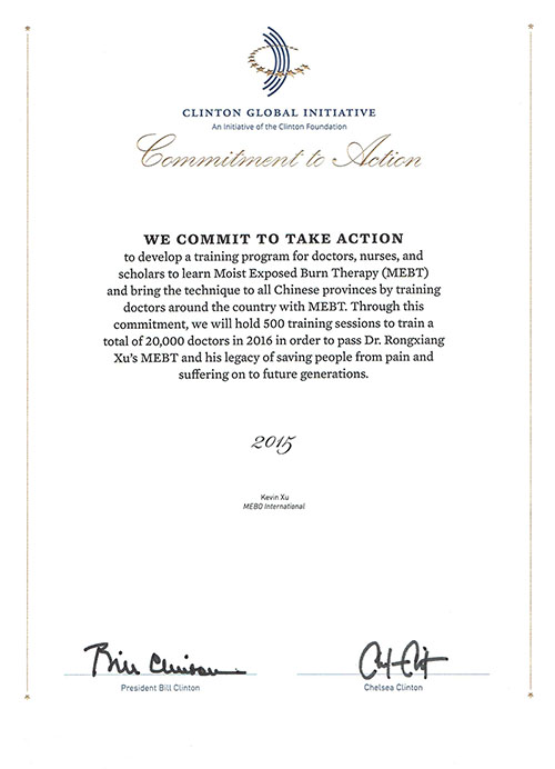 美寶國際作為克林頓全球倡議委員會成員,于2015年9月,聯(lián)合中國中西醫(yī)結(jié)合學(xué)會燒傷專業(yè)委員會,在克林頓年會上,發(fā)起承諾“從城市到鄉(xiāng)村:再生醫(yī)療技術(shù)(MEBT)醫(yī)師培訓(xùn)”計劃,在全球范圍內(nèi)推廣再生醫(yī)療技術(shù)培訓(xùn)。