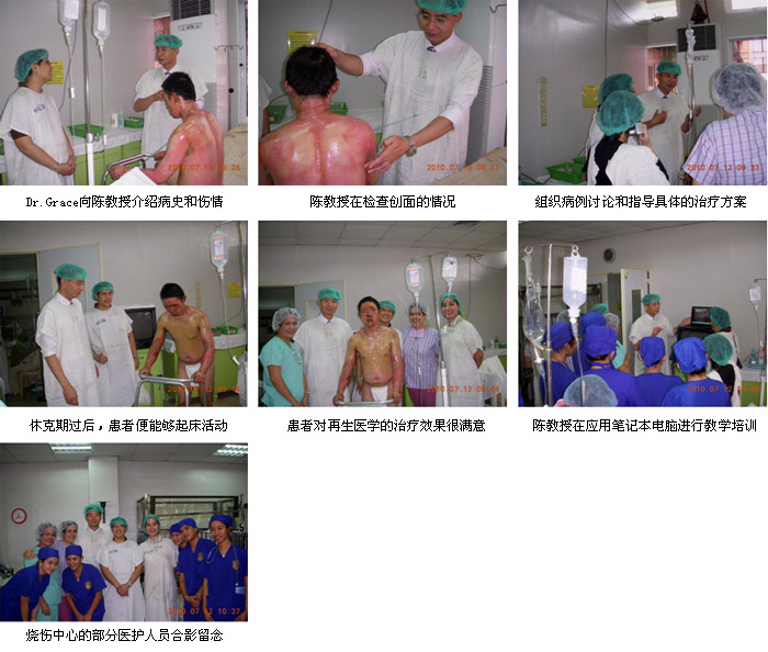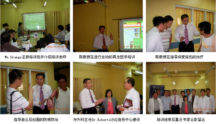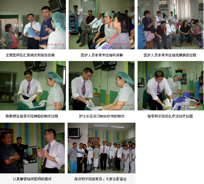 2010年7月7日首家再生醫(yī)學燒傷創(chuàng)瘍治療中心在菲律賓首都馬尼拉正式掛牌成立后,來自中國北京MEBO燒傷創(chuàng)瘍研究所國際部的徐沖與菲律賓方面負責再生醫(yī)學技術推廣的Ms.Orange進行了認真的討論、組織和策劃,在接下來的5天時間里,成功展開了一系列的、方式靈活的醫(yī)療開發(fā)和維護工作。期間,中國燒傷創(chuàng)瘍科技中心臨床部主任、北京榮祥再生醫(yī)學研究所副所長、北京中西醫(yī)結合學會燒傷專業(yè)委員會副主任委員陳永翀教授,先后應邀到4家政府醫(yī)院,進行燒傷再生醫(yī)學技術培訓、學術交流,以及到燒傷中心會診指導大面積燒傷病例的治療,受到醫(yī)院、醫(yī)師、護士和患者的歡迎。在短短的5天時間里,舉辦了院級培訓班3期,燒傷中心內(nèi)部培訓2期,重點專家學術交流3次,培訓了燒傷、整形、普通外科、骨科的醫(yī)師和護士59名,對 2家重點老醫(yī)院進行了有效的維護和促進,成功新開發(fā)了2家政府教學醫(yī)院,會診、指導特重度燒傷1例,重度燒傷2例,疤痕1例,實現(xiàn)了較好的醫(yī)療開發(fā)、維護和進一步規(guī)范臨床技術的效果。