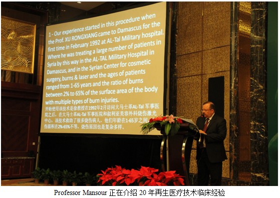 來自敘利亞整形修復(fù)外科中心主任醫(yī)學(xué)博士、整形修復(fù)外科醫(yī)生Adham MANSOUR醫(yī)生與1992年開始接觸再生醫(yī)療技術(shù),至今已經(jīng)有20余年再生醫(yī)療技術(shù)臨床經(jīng)驗(yàn)。自從1992徐教授到敘利亞訪問后,Dr. Mansour 就對再生醫(yī)療技術(shù)產(chǎn)生了濃厚的興趣并開始嘗試使用該技術(shù)治療燒傷病人。在成功救治了無數(shù)不同面積類型燒傷患者后,他又大膽嘗試將該技術(shù)應(yīng)用于其他創(chuàng)面。經(jīng)過20多年的臨床應(yīng)用,他已經(jīng)成功的將再生醫(yī)療技術(shù)應(yīng)用于各類型燒傷創(chuàng)面,激光美容創(chuàng)面,整形創(chuàng)面等并通過大量鮮明的治療前后對比照片展示了再生醫(yī)療技術(shù)的優(yōu)越性,現(xiàn)場代表無不折服。