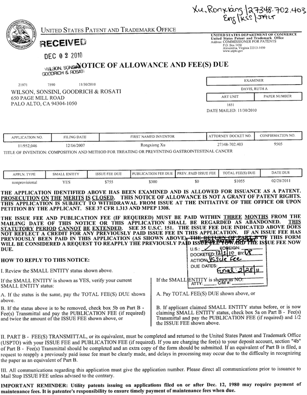 美國(guó)專(zhuān)利局專(zhuān)利授權(quán)通知:
