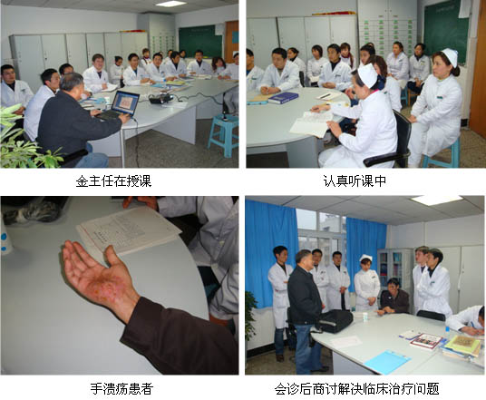學術會議由戴主任主持,金教授先向大家介紹了燒傷及燒傷皮膚原位再生醫(yī)療技術的概念,而該技術是由濕潤暴露療法和濕潤燒傷膏來共同完成;介紹了暴露療法創(chuàng)面處理的原則、處理方式、規(guī)范換藥技術以及各類深淺度燒傷、潰瘍、褥瘡、糖尿病足、斷指再生等創(chuàng)面的處理方法;并通過展示大量真實的臨床病例圖片,使大家真正了解皮膚原位再生醫(yī)療技術及其再生產(chǎn)品的先進性、實用性;隨后金教授介紹了再生醫(yī)療技術新產(chǎn)品—創(chuàng)瘍貼對壓瘡、糖尿病足潰瘍等創(chuàng)面的治療,并介紹了其作用原理、產(chǎn)品組成結構、各類創(chuàng)面使用的方法等;還著重講解了在5.12四川災區(qū)應用再生醫(yī)療技術治療眾多患者所取得的良好療效。在金教授課結束后,參會人員結合實際工作中所遇的問題紛紛提問,如取皮后,使用濕潤燒傷膏或速愈貼遇滲血情況如何處理,燒傷膏油紗條如何制作,III度燒傷創(chuàng)面是否采用包扎療法等,現(xiàn)場氣氛十分活躍,金教授一一為大家做了細致回答,并在會議結束后對一位手部創(chuàng)傷患者進行了會診。