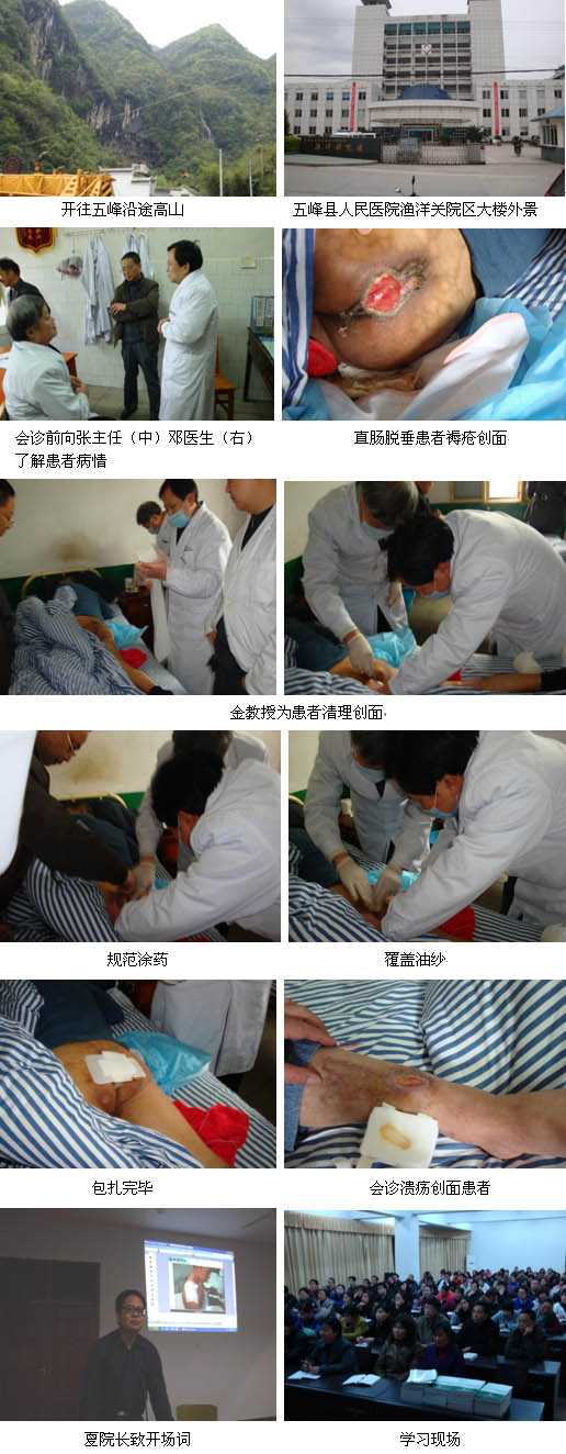 五峰土家族自治縣位于鄂西南邊陲,距宜昌市200公里,無(wú)高等級(jí)公路,山大人稀。一路蜿蜒顛簸,金黨軍教授歷經(jīng)了三個(gè)半小時(shí)車程到達(dá)漁洋關(guān)鎮(zhèn)。得知金教授來(lái)院授課,醫(yī)院夏院長(zhǎng)、醫(yī)務(wù)科李科長(zhǎng)和外科張主任熱情地接待了金教授,雙方就醫(yī)院目前發(fā)展的情況及再生醫(yī)學(xué)近期所取得的成就做了簡(jiǎn)單地交流。該院外科為骨科、普外科等,該科于今年二月初引進(jìn)新一代功能復(fù)合輔料創(chuàng)瘍貼,取得了不錯(cuò)的臨床療效。2002年8月五峰縣漁洋關(guān)鎮(zhèn)唐黃坪煤礦發(fā)生重大瓦斯爆炸事故,八人遇難,第九人是由該院張主任應(yīng)用的濕性醫(yī)療技術(shù)和美寶濕潤(rùn)燒傷膏將患者治愈,因此,再生醫(yī)療技術(shù)的神奇療效該院領(lǐng)導(dǎo)并不陌生??紤]到醫(yī)護(hù)人員的工作時(shí)間,夏院長(zhǎng)和李科長(zhǎng)將學(xué)術(shù)講座的時(shí)間定在晚上七點(diǎn)到九點(diǎn)。下午四點(diǎn),張主任陪同金教授到該院的住院病區(qū)進(jìn)行患者會(huì)診,其中一位為直腸脫垂、骶尾處褥瘡的老年患者,另一位患者為下肢潰瘍創(chuàng)面,創(chuàng)面較深。金教授分別為兩位患者清理創(chuàng)面后,進(jìn)行換藥,并制作油紗敷貼包扎,為醫(yī)務(wù)人員進(jìn)行換藥示范。