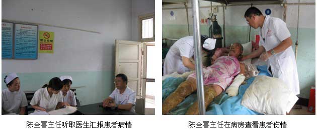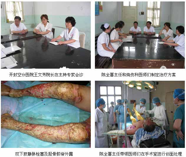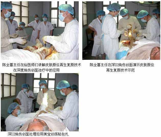 2011年7月2日,北京美寶燒傷創(chuàng)瘍研究所臨床部專家陳全喜主任應邀來到河南開封空分集團有限公司醫(yī)院會診一位嚴重燒傷患者?;颊撸簭埬衬常?,64歲。入院診斷:雙上肢、雙下肢深Ⅲ度燒傷,燒傷面積44%TBSA?;颊呷朐簳r基本情況:面色蒼白,四肢冷,皮膚干燥,脈搏100次/分,呼吸29次/分,血壓80/60mmHg,煩躁。經會診后陳主任指導院方制定了搶救方案。入院立即應用皮膚原位再生復原技術治療,包括抗休克、保護心腎功能等系統(tǒng)治療;創(chuàng)面減張,濕潤燒傷膏油紗條半暴露治療;保護肢體血液循環(huán),防止創(chuàng)面損傷加深等措施。待病情穩(wěn)定后于2011年7月4日上午,在王志英副院長、鄭玉紅主任和陳全喜主任一起為患者進行了減張耕耘術治療,術后應用再生醫(yī)用復合敷料-美寶創(chuàng)瘍貼對患者的創(chuàng)面進行了包扎,并根據病情及時換藥。目前患者病情穩(wěn)定,正在進一步的治療中。