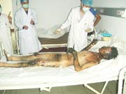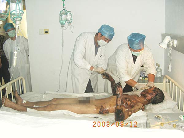 2003年9月11日上午10時(shí),河北武安某煤礦因瓦斯爆炸致11人燒傷,其中8例傷情較重的出者于傷后2小時(shí)轉(zhuǎn)入河北省邢臺(tái)礦物局總醫(yī)院;該批患者入院后,該院燒傷科的全體醫(yī)護(hù)人員緊急行動(dòng)起來(lái),在檢查傷情的同時(shí),立即給該批燒傷患者建立靜脈通道,進(jìn)行有效復(fù)蘇抗休克的同時(shí),創(chuàng)面創(chuàng)面處理采用我國(guó)著名生命科學(xué)家徐榮樣教授發(fā)明的燒傷皮膚再生醫(yī)療技術(shù);因該批患者傷情較重,該院于當(dāng)日下午近6時(shí),緊急向全國(guó)燒傷救治網(wǎng)指揮部求援,中國(guó)燒傷創(chuàng)瘍科技中心臨床總部主任王洪生接到求援電話后,在中秋夜從北京乘火車趕赴河北邢臺(tái)的同時(shí),還與河北省人民醫(yī)院副院彭彥輝取得聯(lián)系,請(qǐng)其派該院燒傷專家一同前往邢臺(tái)協(xié)助對(duì)該批病人的搶救,在彭院長(zhǎng)指示下,該院醫(yī)務(wù)科指派燒傷科碩士研究生韓勝?gòu)氖仪f趕赴邢臺(tái),王洪生主任與韓勝主治大夫于次日晨1時(shí)在邢臺(tái)火車站會(huì)合并于20分后一同趕到邢臺(tái)礦物局總醫(yī)院燒傷科,到達(dá)該院后,王主任和韓大夫不顧長(zhǎng)途勞頓,立即在該院燒傷科張繼海等醫(yī)生的陪同下,深入燒傷病房對(duì)該批8例燒傷患者逐一進(jìn)行檢查,經(jīng)檢查發(fā)現(xiàn)該批燒傷患者中有4例為特重度燒傷(其中2例燒傷總面積在 5l~54% 之間,另外2例燒傷總面積達(dá)60%),有3例為重度以上燒傷,燒傷總面積在37~38%之間;還有1例燒傷面積為l6%;在檢查中還發(fā)現(xiàn)該批患者燒傷創(chuàng)面大部分屬深二度及混合度燒傷。檢查患者后,王主任向值班大夫指出了在大面積燒傷患者休克期治療中,避動(dòng)、保暖、簡(jiǎn)單清創(chuàng)、強(qiáng)心、護(hù)腎、適當(dāng)輸液( 以尿量作為參考指標(biāo))和早用廣譜、高效、低毒抗菌素、盡早進(jìn)行胃腸道高營(yíng)養(yǎng)等措施為治療的重要環(huán)節(jié),目前對(duì)這批重度以上燒傷患者的治療要緊緊圍繞這些環(huán)節(jié)來(lái)進(jìn)行;在當(dāng)日上午8時(shí),王主任和韓大夫又在該院燒傷科醫(yī)生辦公室就燒傷創(chuàng)面的規(guī)范化處理、全身綜合治療與該科的全體醫(yī)護(hù)人員進(jìn)行了廣泛而深入的交流,而后又指導(dǎo)該科大夫?yàn)樵撆鸁齻颊呦箩t(yī)囑,緊接著王主任和韓大夫又帶領(lǐng)該科醫(yī)護(hù)人員為該批燒傷患者進(jìn)行創(chuàng)面換藥以示范規(guī)范的創(chuàng)面處理技術(shù)。目前,韓大夫還繼續(xù)留守在該院指導(dǎo)對(duì)該批燒傷患者的搶教工作,且該批患者病情平穩(wěn),正在進(jìn)一步治療中。