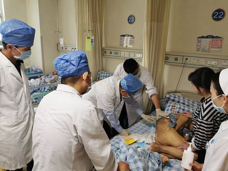 會后,在向亞東院長的陪同下對醫(yī)院進行了參觀并了解了醫(yī)院的發(fā)展概況,雙方就醫(yī)院的發(fā)展,醫(yī)院管理,醫(yī)療技術進行了深入交流,賴登祥教授創(chuàng)面修復團隊還現(xiàn)場為一位燙傷患者進行了教學換藥。這次推廣活動,不僅為偏遠鄉(xiāng)鎮(zhèn)衛(wèi)生院送來了先進技術,更是一次先進醫(yī)學理念的普及和教育。向亞東院長表示,隨著人口老年化,各種慢性創(chuàng)面呈上升趨勢,非常適合在基層醫(yī)療單位推廣應用,接下來會安排人員學習進修,為當?shù)貪M瘡患者帶去福音。