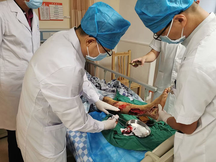 10月26日,《中國燒傷創(chuàng)瘍雜志》編委、燒傷創(chuàng)瘍再生醫(yī)療技術臨床專家張強教授,受邀來到淮南壽縣諧和醫(yī)院,對一例97歲高齡糖尿病足患者進行創(chuàng)面壞死組織清除術和再生醫(yī)療技術規(guī)范換藥,受到醫(yī)患雙方高度評價!